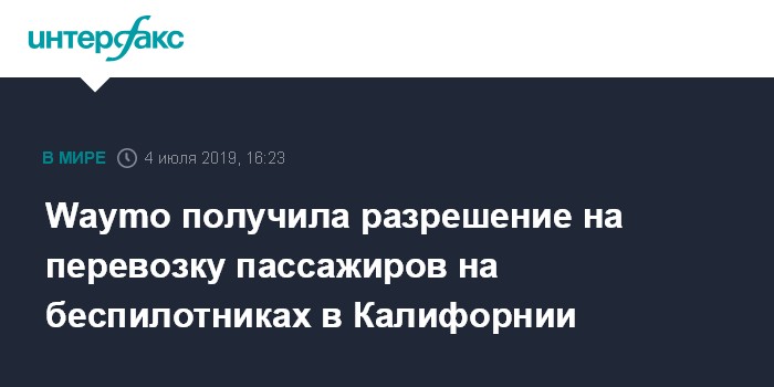Москва. 4 июля. INTERFAX.RU - Американские регуляторы в Калифорнии позволили компании Waymo (входит в группу Alphabet), занимающейся разработкой технологий для самоуправляемых автомобилей, перевозить пассажиров на беспилотных такси.