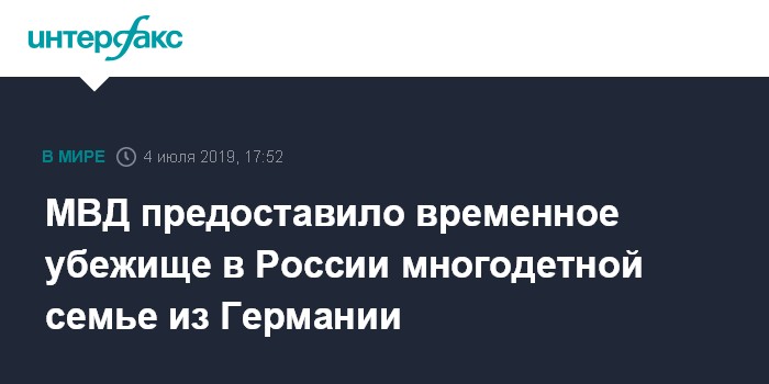 Москва. 4 июля. INTERFAX.RU - Руководство МВД решило предоставить временное убежище многодетной семье Грисбах из Германии, сообщила пресс-служба ведомства. Ранее СМИ сообщали, что членам семьи не нравится чрезмерное внимание органов опеки к многодетным семьям, уроки секспросвета в школах и "тоталитаризм" в ФРГ.