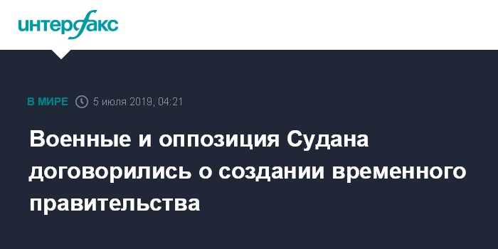 Москва. 5 июля. INTERFAX.RU - Переходный военный совет Судана и оппозиционное объединение "Силы за свободу и перемены" в ходе двухдневных переговоров договорились о создании временного гражданского правительства.