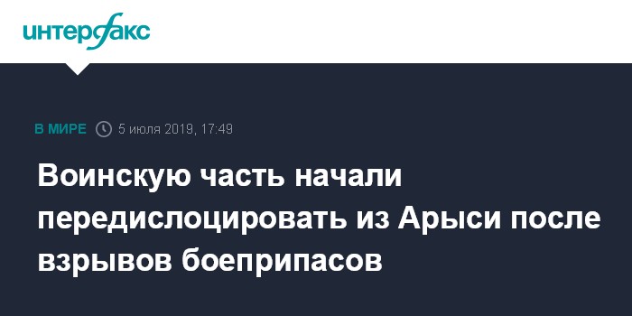 Москва. 5 июля. INTERFAX.RU - После пожара и взрывов на складе с боеприпасами из города Арысь в Туркестанской области начали выводить располагавшуюся там воинскую часть №44856. Об этом сообщила пресс-служба Минобороны Казахстана. Вывести часть в безопасное для людей место распорядился президент Касым-Жомарт Токаев.