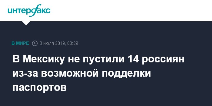 Москва. 8 июля. INTERFAX.RU - 14 человек с российскими паспортами не пустили в Мексику 6 июля, они могли использовать поддельные документы, сообщает в твиттере посольство России в Мексике.