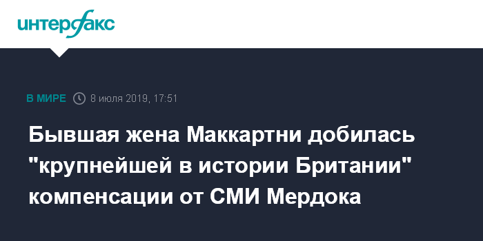 Москва. 8 июля. INTERFAX.RU - Бывшая жена Пола Маккартни Хизер Миллс заявила, что получила извинения и "крупнейшую в истории Великобритании" компенсацию от медиахолдинга Руперта Мердока News Group Newspapers за вторжение в ее личную жизнь, взлом ее телефона и клеветнические публикации о ней. Как сообщает BBC News, с этим заявлением Миллс выступила у Высокого суда в Лондоне после заседания, на котором были урегулированы ее претензии.