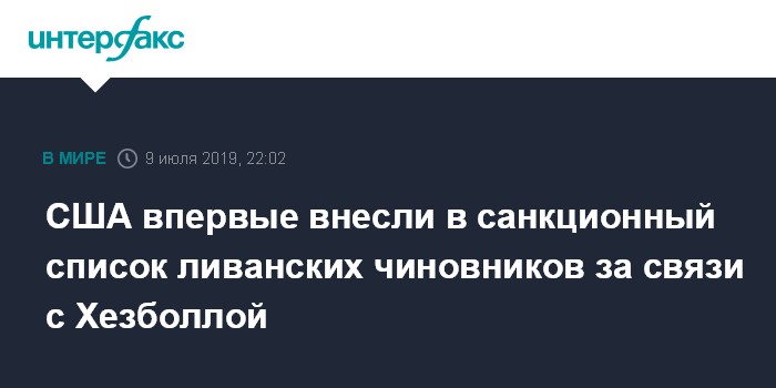 Москва. 9 июля. INTERFAX.RU - Министерство финансов США впервые внесло в санкционный список двух депутатов ливанского парламента и сотрудника службы безопасности Ливана, которые поддерживают радикальное движение "Хезболла". Об этом говорится в пресс-релизе, опубликованном во вторник на сайте Минфина.