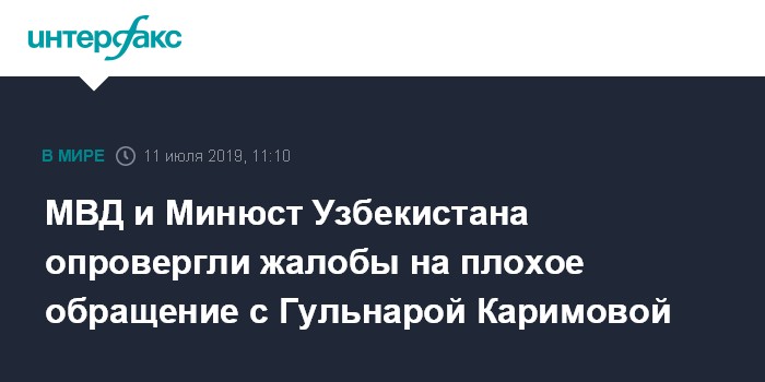 Москва. 11 июля. INTERFAX.RU - В МВД и Минюсте Узбекистана опровергли утверждение о том, что осужденной дочери покойного президента страны Ислама Каримова Гульнаре не предоставляют необходимую медицинскую помощь в колонии и что на нее оказывают давление. Запись об этом 3 июля появилась в инстаграме дочери Гульнары Каримовой Иман.