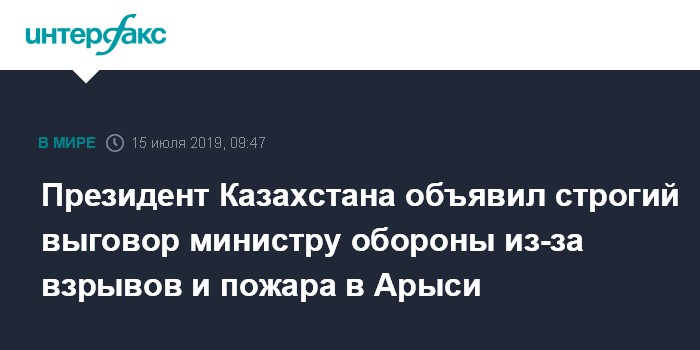 Москва. 15 июля. INTERFAX.RU - Министр обороны Казахстана Нурлан Ермекбаев получил строгий выговор от президента Касым-Жомарта Токаева за недостаточные усилия по устранению системных недостатков в его ведомстве и в войсках в связи с пожаров и взрывами боеприпасов в воинской части в городе Арысь. Президент объявил об этом на расширенном заседании правительства.