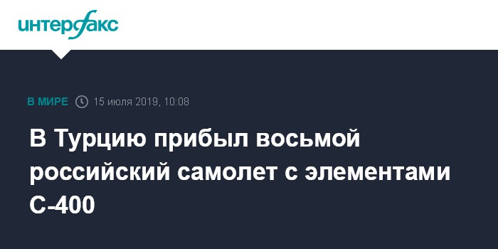 Москва. 15 июля. INTERFAX.RU - Восьмой российский грузовой самолет в понедельник доставил элементы ЗРС С-400 в Турцию, сообщает информагентство Anadolu со ссылкой на Минобороны.