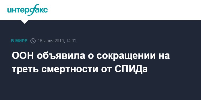 Москва. 16 июля. INTERFAX.RU - В 2018 году в мире от ВИЧ умерли около 770 тысяч человек, это на треть меньше, чем в 2010 году, говорится в докладе Объединенной программы ООН по ВИЧ/СПИД (UNAIDS). Сокращение смертности авторы доклада связали с повышением доступности лечения, в первую очередь в Восточной и Южной Африке.