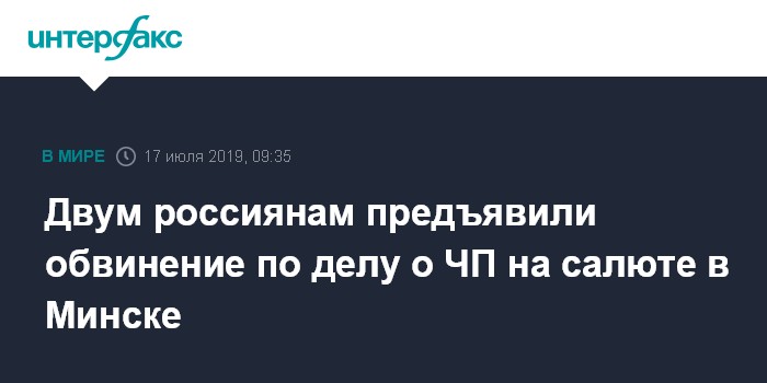 Москва. 17 июля. INTERFAX.RU - Двум гражданам РФ - сотрудникам компании "Пиро Росс" из Сергиева Посада - предъявлено обвинение по делу о ЧП на салюте в Минске, в результате которого погиб один человек, сообщили "Интерфаксу" в пресс-службе посольства РФ.