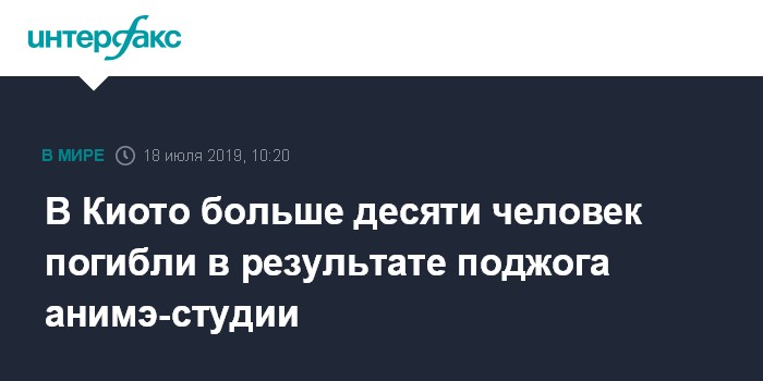 Москва. 18 июля. INTERFAX.RU - В Киото произошел сильный пожар в анимэ-студии Kyoto Animation. Полиция проверяет версию поджога, предполагаемый поджигатель задержан. По последним данным, погибли 12 человек, сообщили телеканалу NHK в полиции.