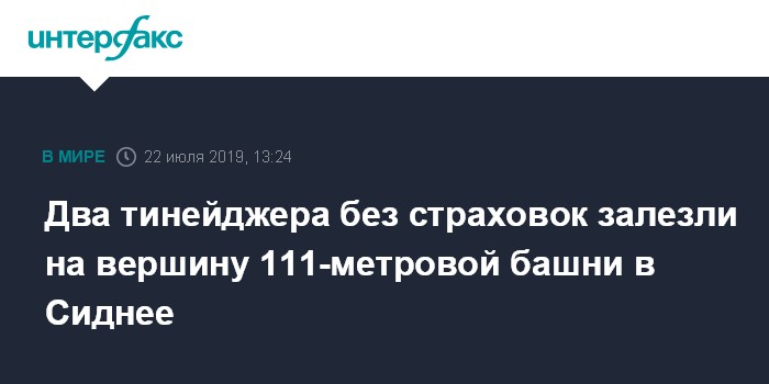 Москва. 22 июля. INTERFAX.RU - В Сиднее два тинейджера были задержаны после того, как залезли на вершину шпиля 111-метрового небоскреба в Сиднее - башни AWA. Об этом пишет Sydney Morning Herald со ссылкой на очевидца и на представителей полиции штата Новый Южный Уэльс.