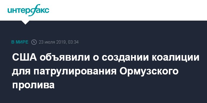 Москва. 23 июля. INTERFAX.RU - Соединенные Штаты создают коалицию по патрулированию Ормузского пролива, в которой будут участвовать страны со всего мира, сообщил в интервью телекомпании WFTV 9 госсекретарь США Майк Помпео.