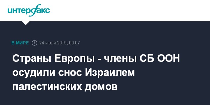 Москва. 24 июля. INTERFAX.RU - Пять членов СБ ООН - Германия, Великобритания, Бельгия, Польша и Франция - во вторник осудили снос Израилем палестинских построек в Восточном Иерусалиме.