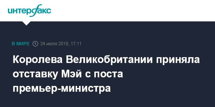 Москва. 24 июля. INTERFAX.RU - Королева Великобритании Елизавета II в среду на аудиенции в Букингемском дворце приняла отставку премьер-министра Великобритании Терезы Мэй, сообщается в официальном твиттере королевской семьи.