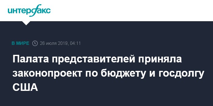 Москва. 26 июля. INTERFAX.RU - Палата представителей Конгресса США поддержала в четверг законопроект о бюджете на 2020-2021 финансовые годы, который продлит на два года срок наступления потолка госдолга и увеличит государственные расходы на $320 млрд.