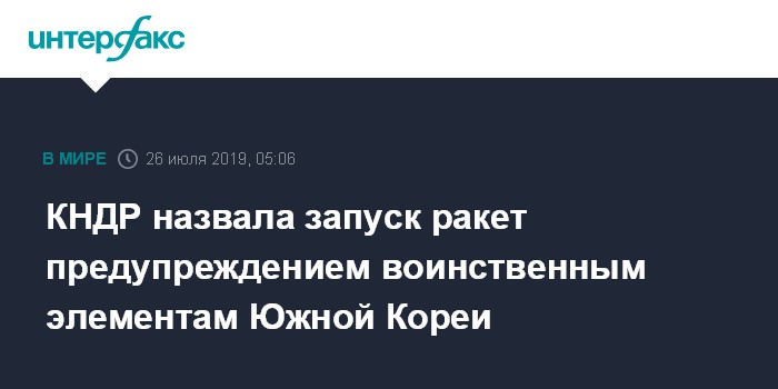 Москва. 26 июля. INTERFAX.RU - КНДР провела запуск двух ракет в четверг, чтобы продемонстрировать силу и предупредить "воинственных элементов" Южной Кореи, сообщает северокорейское агентство ЦТАК.