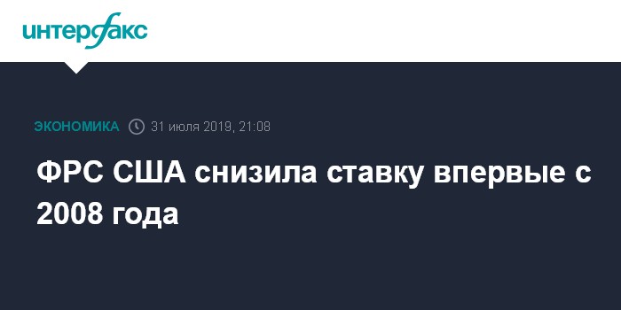 Москва. 31 июля. INTERFAX.RU - Федеральная резервная система США снизила базовую процентную ставку на 0,25 процентных пункта, до 2-2,25%, говорится в сообщении Федерального комитета по открытым рынкам (FOMC). Такого решения ожидали рынки и большинство аналитиков.
