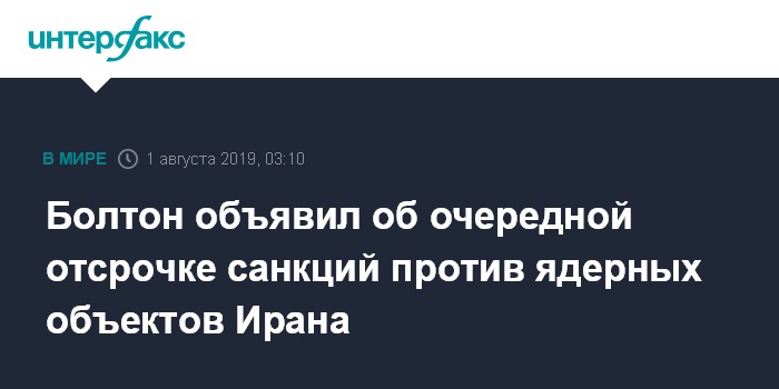 Москва. 1 августа. INTERFAX.RU - Соединенные Штаты продлят на 90 дней исключения из санкций для ядерных объектов Ирана, заявил советник президента США по нацбезопасности Джон Болтон в интервью Fox Business.