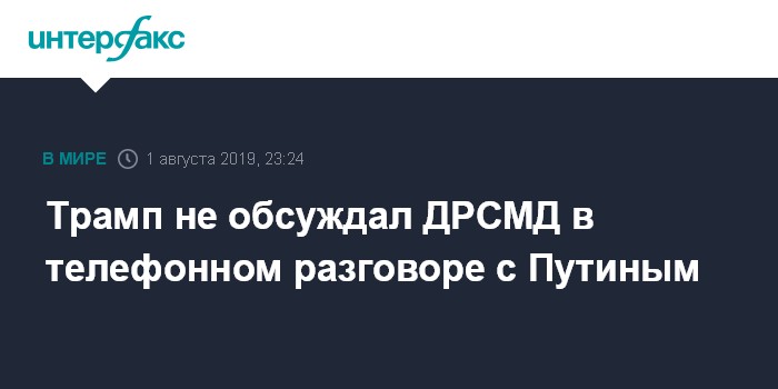 Москва. 1 августа. INTERFAX.RU - Президент США Дональд Трамп заявил в четверг, что в ходе телефонного разговора с Владимиром Путиным на этой неделе не обсуждал судьбу ДСРМД, сообщило агентство Bloomberg.