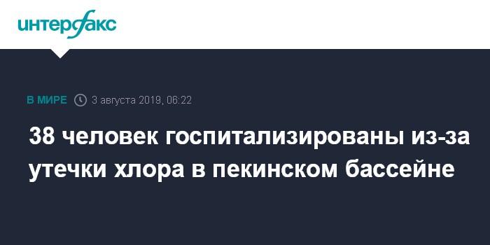 Москва. 3 августа. INTERFAX.RU - Не менее 38 человек госпитализированы из-за предположительной утечки хлора в бассейне на юго-западе Пекина, сообщает в субботу China Daily.