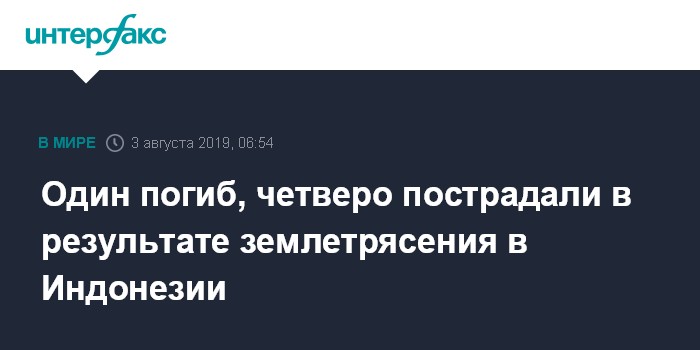 Москва. 3 августа. INTERFAX.RU - Один человек погиб, четверо пострадали в результате землетрясения магнитудой 6,9 на острове Ява на восточном побережье Индонезии, сообщает газета The Strait Times.
