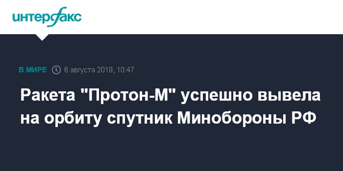 Москва. 6 августа. INTERFAX.RU - Спутник Минобороны РФ, запущенный во вторник с космодрома "Байконур", успешно выведен в установленное время на расчетную орбиту, сообщили в министерском департаменте информации и массовых коммуникаций.