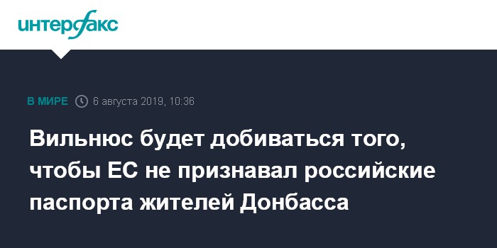 Москва. 6 августа. INTERFAX.RU - МИД Литвы приложит усилия к тому, чтобы Евросоюз отказался признавать российские паспорта, которые выдают в упрощенном порядке жителям районов Донбасса, неподконтрольных Киеву. Если этого добиться не получится, Вильнюс примет односторонние меры, сообщили BNS в пресс-службе МИД.