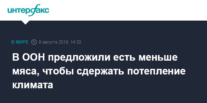 Москва. 8 августа. INTERFAX.RU - В четверг был опубликован доклад ООН "Климатические изменения и земля". В нем отмечается, что изменение климата будет все больше влиять на продовольственную безопасность в мире. Притормозить изменение климата поможет сбалансированная растительная диета, считают в ООН.