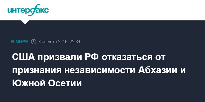 Москва. 8 августа. INTERFAX.RU - США в 11-годовщину начала операции Грузии против Южной Осетии вновь призвали Россию отказаться от признания независимости Абхазии и Южной Осетии, заявила в четверг представитель госдепа США Морган Ортагус.