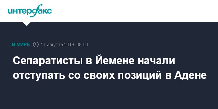 Москва. 11 августа. INTERFAX.RU - Отряды сепаратистов из Южного переходного совета (ЮПС) начали отступление с контролируемых ими позиций в Адене, где размещается признанное международным сообществом Йемена, сообщил в воскресенье телеканал Al Arabiya.