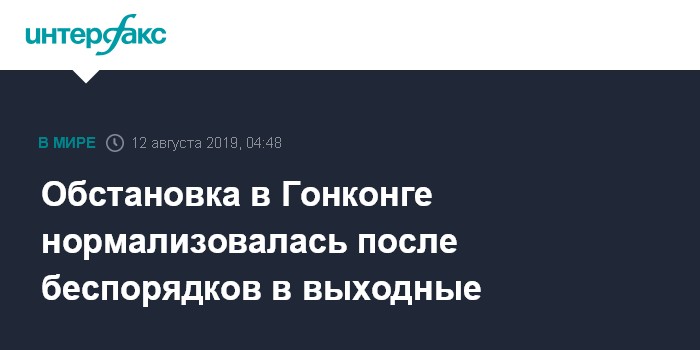 Москва. 12 августа. INTERFAX.RU - После массовых демонстраций в выходные, сопровождавшихся беспорядками и столкновениями с полицией, в понедельник в Гонконге наблюдается спокойствие.