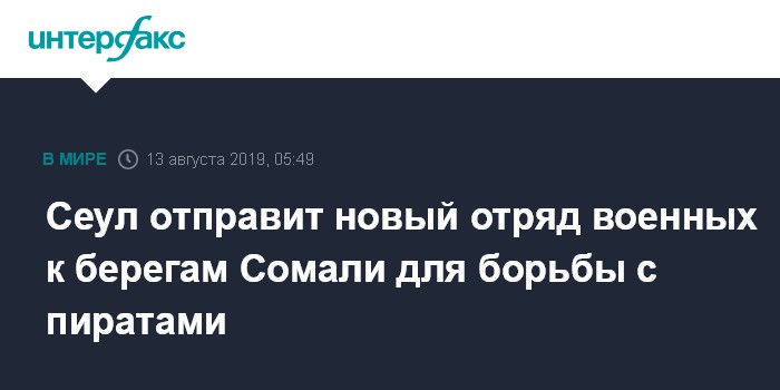 По данным ВМС страны, 30-й отряд подразделения южнокорейских ВМС "Чхонхэ" отправится из Пусана к побережью Сомали для борьбы с пиратами. Военные будут обеспечивать защиту судов от нападений пиратов в течение шести месяцев, начиная с сентября.