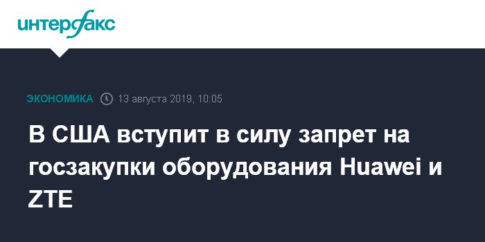 Москва. 13 августа. INTERFAX.RU - 13 августа в США вступит в силу запрет на закупки государственными структурами и компаниями оборудования китайских компаний Huawei и ZTE, а также их "дочек" Hytera Communications Corporation, 34 Hangzhou Hikvision Digital Technology Company и Dahua Technology Company. Об этом свидетельствуют данные Федерального реестра США.