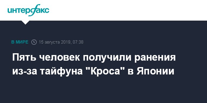 Москва. 15 августа. INTERFAX.RU - Пять человек получили ранения в результате мощного тайфуна "Кроса", обрушившегося на Японию, сообщает агентство Kyodo.