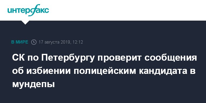 Москва. 17 августа. INTERFAX.RU - В Петербурге следователи проводят проверку по факту возможного нападения сотрудника полиции на кандидата в муниципальные депутаты. Проверку начали после появления сообщений об инциденте в соцсетях и СМИ.