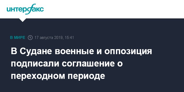 Москва. 17 августа. INTERFAX.RU - Военный совет Судана и оппозиционная коалиция в субботу подписали соглашение о переходном периоде, которое позволит осуществить постепенный переход от военного к гражданскому правительству, передает канал Al Arabiya.