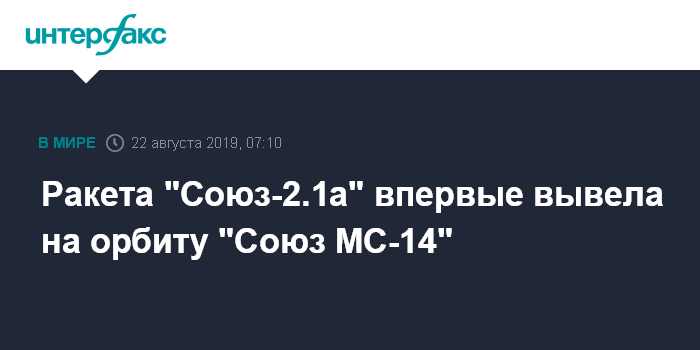После старта с космодрома Байконур в 06:38 мск, ракета "Союз-2.1а" вывела ТПК "Союз МС-14" за пределы атмосферы. Отделение всех трех ступеней прошло штатно. Это был первый старт ракеты "Союз-2" в связке с пилотируемым кораблем "Союз МС". В настоящее время экипажи отправляются на МКС при помощи ракеты "Союз-ФГ", однако у "Роскосмоса" осталась в запасе только одна такая ракета. Она в конце сентября отправит на МКС очередную экспедицию.
