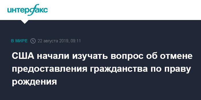 Москва. 22 августа. INTERFAX.RU - Президент США Дональд Трамп заявил в среду, 21 августа, что его администрация рассматривает вопрос о прекращении практики предоставления американского гражданства по праву рождения.