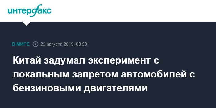 Москва. 22 августа. INTERFAX.RU - В Китае в экспериментальном порядке могут быть определены специальные зоны, куда будет запрещен въезд автомобилям с двигателями, работающими на бензине. Об этом сообщило министерство промышленности и информатизации Китая.