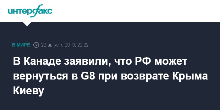 Москва. 22 августа. INTERFAX.RU - Россия может вновь стать членом G8 в случае возврата Крыма Киеву и прекращения конфликта на востоке Украины, заявила в четверг глава МИД Канады Христя Фриланд.