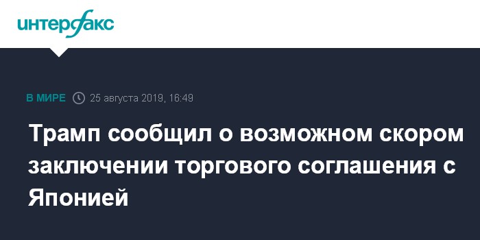 Москва. 25 августа. INTERFAX.RU - Торговое соглашение с Японией может быть заключено совсем скоро, сообщил в воскресенье в Биаррице президент Трамп журналистам, сопровождающим его на саммите G7.