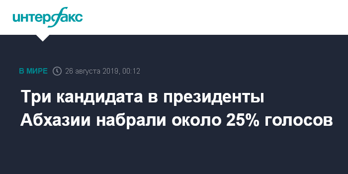 Москва. 26 августа. INTERFAX.RU - Представители штабов трех кандидатов в президенты Абхазии опубликовали в соцсетях предварительные данные итогов голосованиях, согласно которым действующий глава республики набирает 26% голосов, советник министра обороны Олег Аршба и лидер оппозиции Алхас Квициния по 25% голосов.