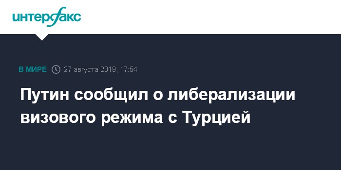 Москва. 27 августа. INTERFAX.RU - Президент РФ Владимир Путин сообщил, что с августа этого года действует безвизовый режим с Турцией для граждан со служебными, специальными паспортами, а также для профессиональных водителей.