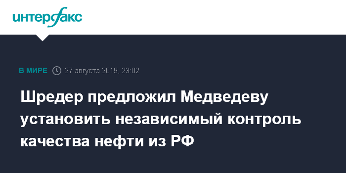 Москва. 27 августа. INTERFAX.RU - Бывший канцлер Германии Герхард Шредер, возглавляющий совет директоров "Роснефти", считает необходимым разрешить независимым инспекторам контролировать качество российской нефти, чтобы "восстановить имидж" после инцидента с "Дружбой". Данное предложение он высказал в письме премьер-министру РФ Дмитрию Медведеву, о содержании которого газете "Ведомости" рассказали шесть источников.
