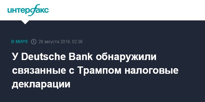 Москва. 28 августа. INTERFAX.RU - Deutsche Bank владеет налоговыми декларациями, поданными президентом США Дональдом Трампом, его семьей или его предприятиями, пишет The Financial Times со ссылкой на письмо немецкого кредитора, поданное в суд США днем во вторник.