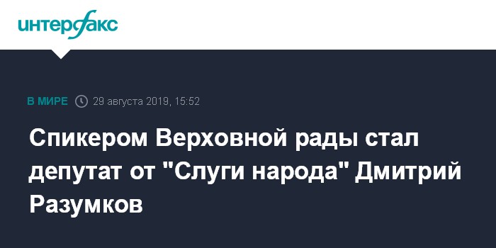 Москва. 29 августа. INTERFAX.RU - Председателем Верховной рады Украины избран председатель президентской партии "Слуга народа" Дмитрий Разумков. За него на первом пленарном заседании нового созыва проголосовали 382 народных депутата.