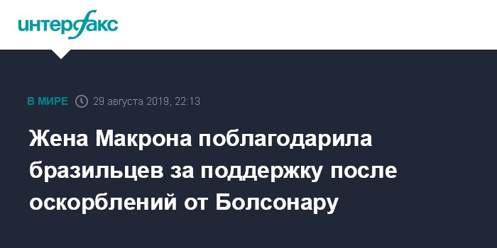 Москва. 29 августа. INTERFAX.RU - Первая леди Франции Брижит Макрон в четверг поблагодарила бразильцев, которые выразили ей поддержку после оскорбительных высказываний президента Бразилии Жаира Болсонару, сообщают французские СМИ.