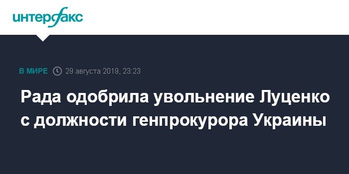 Москва. 29 августа. INTERFAX.RU - Верховная рада Украины дала согласие на увольнение Юрия Луценко с должности генерального прокурора страны по представлению украинского президента Владимира Зеленского.