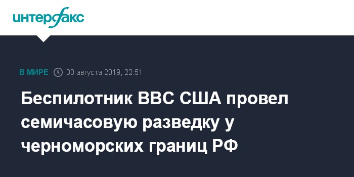 Москва. 30 августа. INTERFAX.RU - Стратегический беспилотный летательный аппарат ВВС США RQ-4A Global Hawk в пятницу совершил многочасовой разведывательный полет вблизи черноморского побережья России, следует из мониторинговых данных западных авиационных ресурсов.