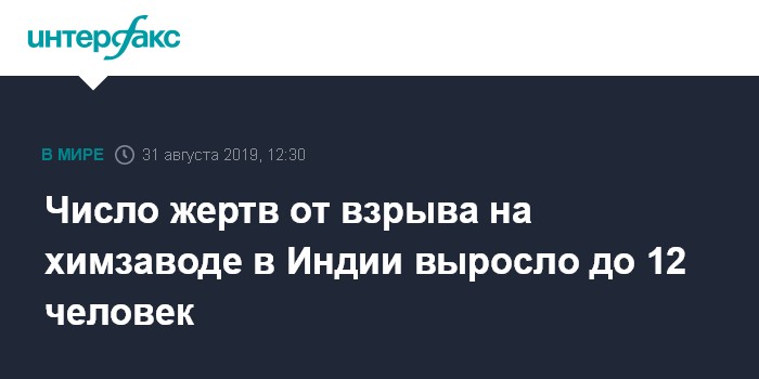 Москва. 31 августа. INTERFAX.RU - По последним данным, 12 человек погибли в результате взрыва на химическом заводе в индийском округе Дхулия (штат Махараштра), сообщает в субботу агентство ANI.
