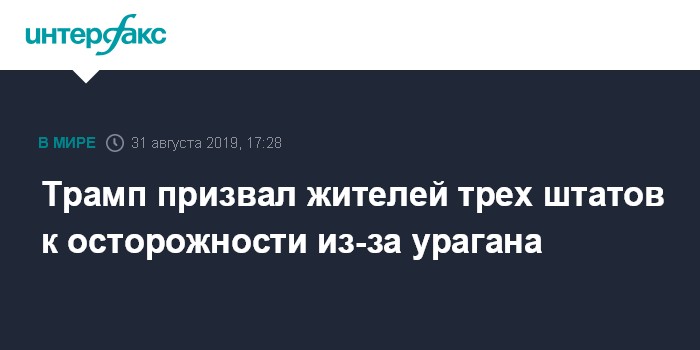 Москва. 31 августа. INTERFAX.RU - Президент США Дональд Трамп в субботу предупредил жителей штатов Джорджия, Южная и Северная Каролина о возможном ударе мощного урагана "Дориан".